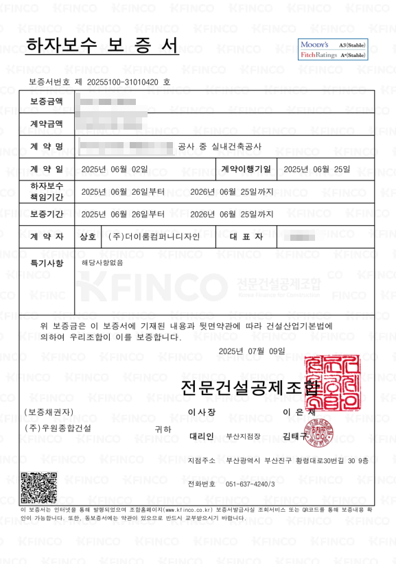 이 증권은 보통 1년간 하자가 발생했을 때, 업체가 보수를 거부하거나 연락이 되지 않을 경우 보험사에서 보상을 해주는 시스템입니다. 시공 후 사후관리를 보장받을 수 있는 중요한 장치입니다.