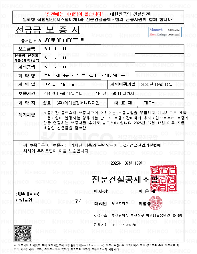 선급금보증서는 소비자가 공사 전 지급하는 계약금이나 선급금에 대해 업체가 약속한 대로 시공하지 않을 경우, 보증기관이 일정 금액을 대신 배상해 주는 제도입니다. 이는 보험과 유사하게 작동하며, 계약이행에 실패할 경우를 대비한 보증장치 역할을 합니다.