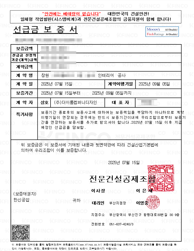 이럴 때를 대비해 선급금 보증서를 발행해 두면, 공제조합이나 보증기관이 해당 금액을 대신 보상해주므로 안심할 수 있습니다. 공사 초기에 비용이 투입되는 구조라면 반드시 발급받아야 하는 필수 보증서입니다.