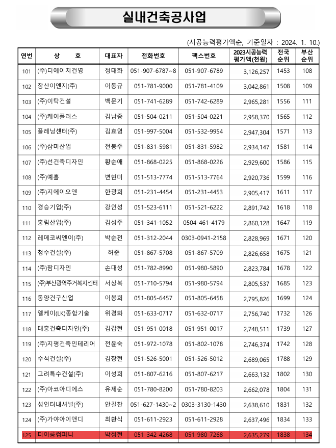 (부산광역시 실내건축공사업 시공능력평가액 상위권 업체 기준)